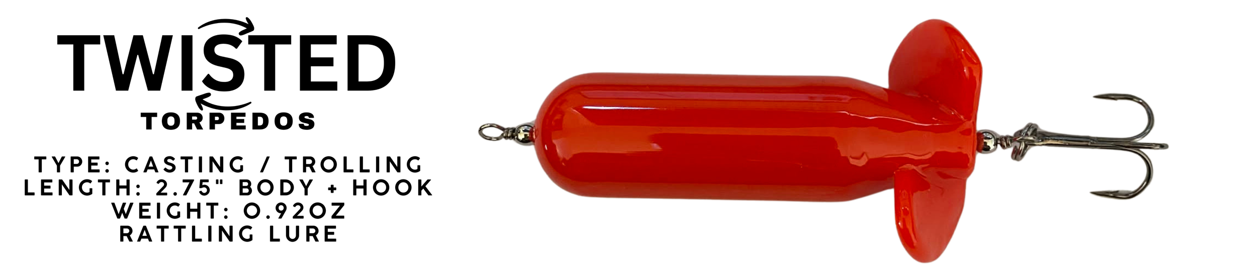The Twisted Torpedo, also known as the Laker Slayer, is a highly effective torpedo-shaped fishing lure designed to imitate a fast, panicked baitfish, triggering aggressive strikes from predatory species. The lure has a compact, streamlined torpedo body that tapers smoothly at both ends, allowing it to cut through water with minimal resistance. This shape enables long, accurate casts and maintains stability even at high retrieval speeds. The body spins around the center shaft creating a powerful wake as it moves and helps to mimic fleeing prey. Twisted Torpedos feature a rattling weighted internal core which produces a low-frequency sound predators can detect from a distance. This rattle paired with a powerful spinning motion when twitched is what often provokes reaction strikes from big predator fish. High-quality, razor-sharp treble hooks are attached via strong split rings to ensure solid hook-ups, even on short strikes. Overall, the torpedo shape excels in open water, around bait schools, and along drop-offs, making it deadly for species like Bass, Pike, Walleye, Lake Trout and anything else is can locks its target onto!